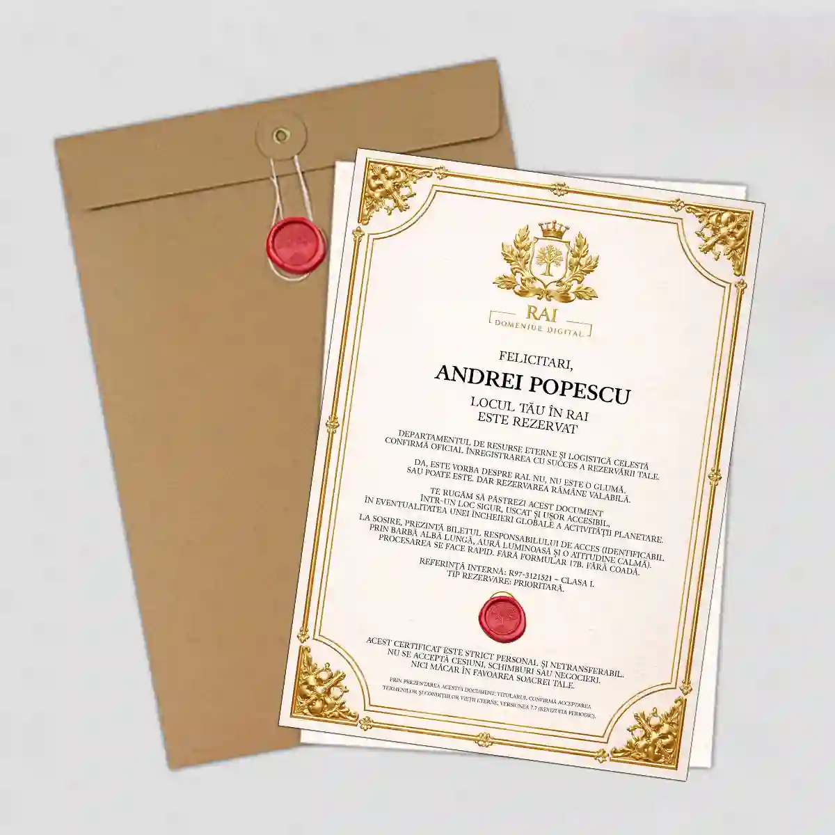 O rezervare simbolică în Rai înseamnă mai mult decât un obiect oferit în dar. Este un gest care creează un moment special pentru parteneri și rămâne o amintire amuzantă. Tocmai pentru că ideea este neașteptată, reacția este aproape întotdeauna una de bucurie și amuzament.